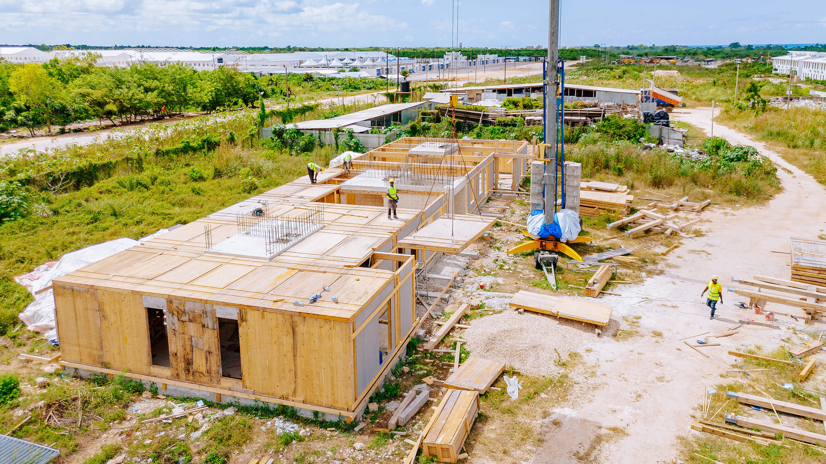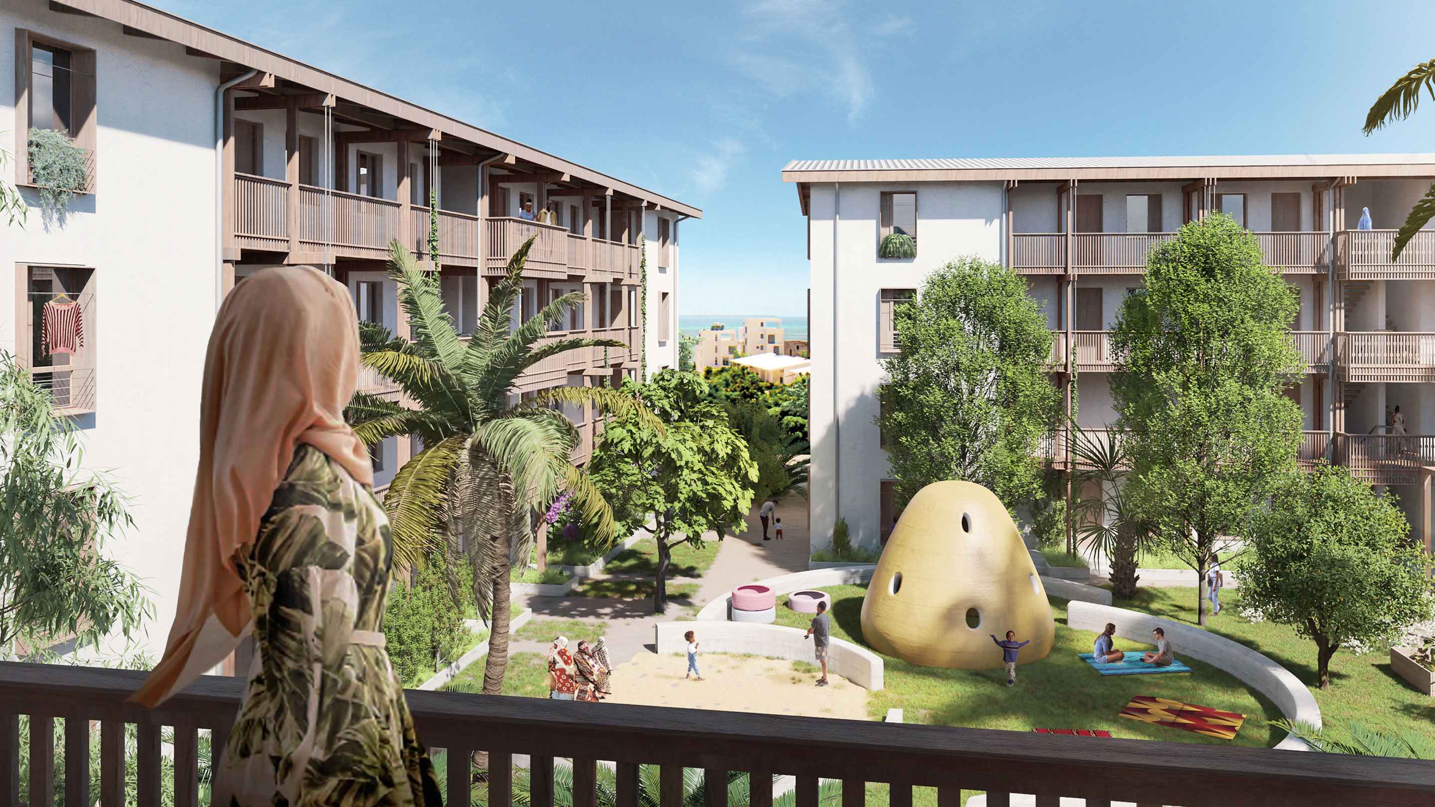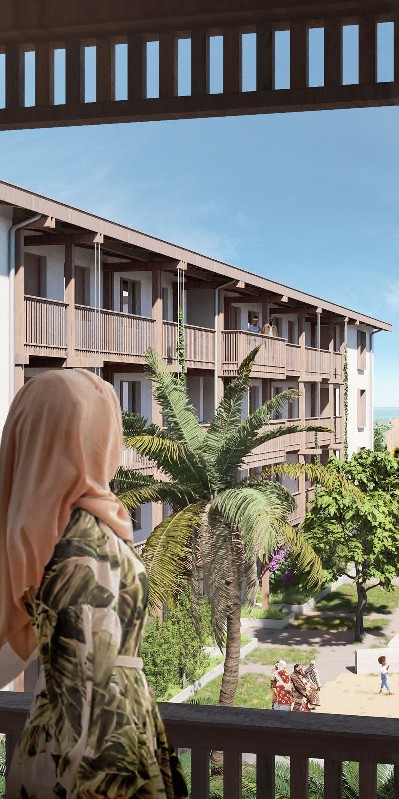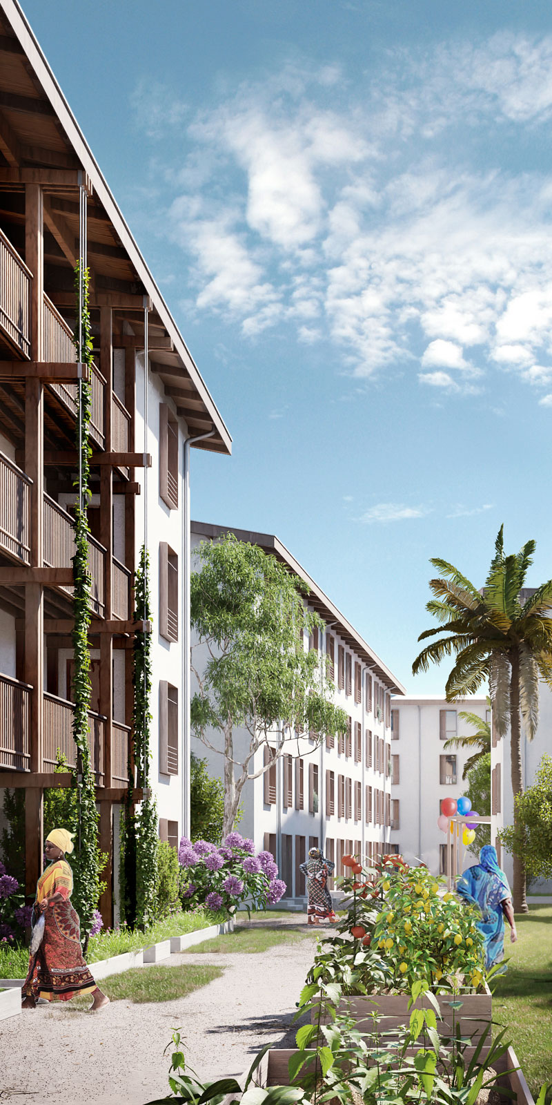 The buildings are designed as sustainable four-story hybrid timber structures with concrete cores. The combination of construction techniques allows for local prefabrication and an efficient assembly process. Timber plays a key role in the design and experience of the project. It not only empowers local industry and craftsmanship but also directly relates back to the local cultural background of Zanzibar and East Africa. A well-balanced design making use of different timber technologies allows the project to align optimized performance criteria with increased construction times and high qualities of finishes to an equitable pricing level.